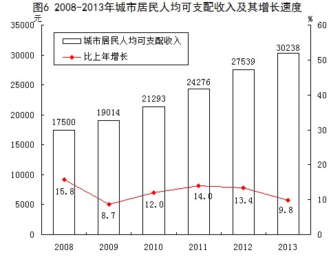 居民收入:城市居民年人均可支配收入30238元,比上年增长9.8%;年人均消费支出22516元,增长10.3%。农村居民年人均纯收入17717元,比上年增长10.8%;年人均生活消费支出8871元,增长16.2%。城市居民家庭恩格尔系数36.3%,农村居民家庭恩格尔系数39.6%。
