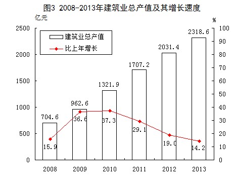 建筑业:全年资质以上建筑业总产值2318.6亿元,比上年增长14.2%。其中,公有制企业412.8亿元,增长10.4%,拉动资质以上建筑业总产值增长1.9个百分点;非公有制企业1905.8亿元,增长15%,拉动资质以上建筑业总产值增长12.2个百分点。全年房屋施工面积11611.9万平方米,比上年下降6.2%。
