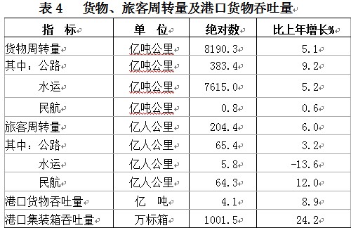 交通运输:全年运输企业客货换算周转量8273.3亿吨公里,比上年增长5.1%。货物周转量8190.3亿吨公里,增长5.1%;旅客周转量204.4亿人公里,增长6%(见表4)。