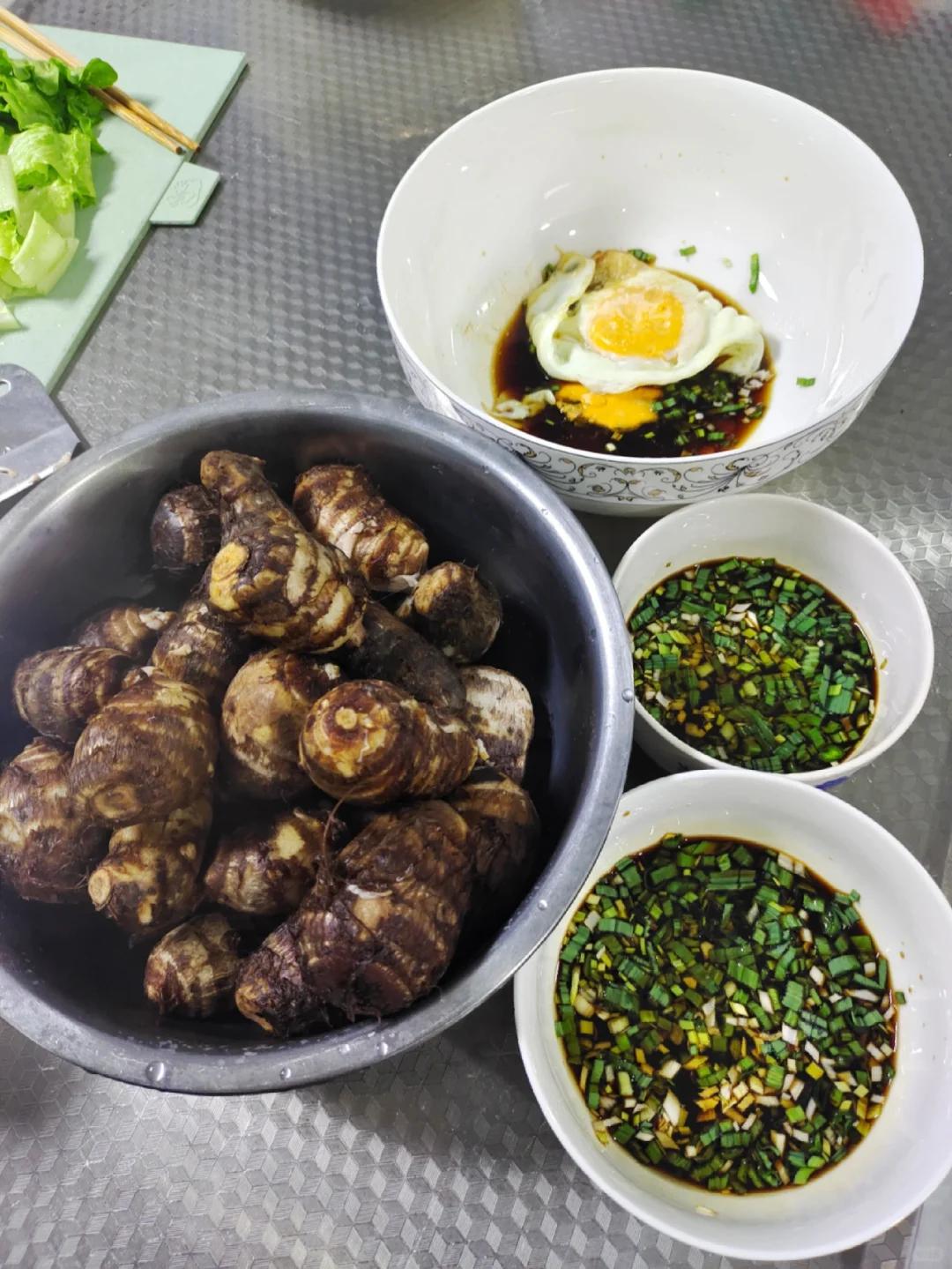 靖江人最常吃的就是清蒸毛芋头。常常搭配着酱油和蒜叶蘸水一样享用。除此还有芋头煮粥,更是黏而不腻。
