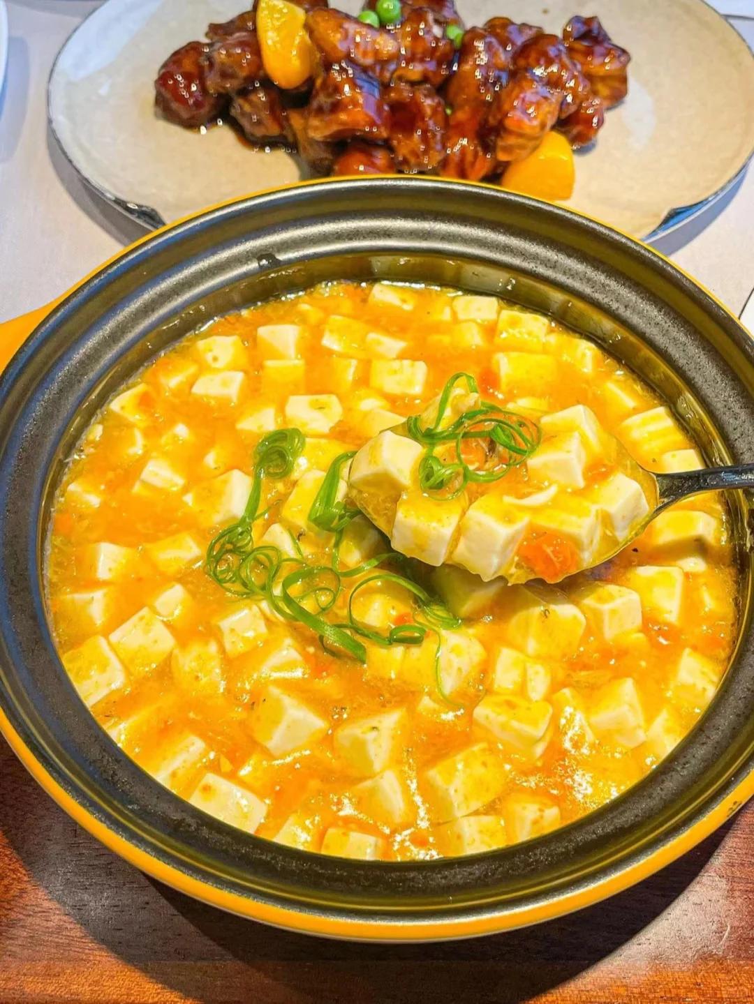 尤其蟹黄汪豆腐,是淮扬菜的名吃。洁白的豆腐,光滑的龙香芋,碧绿的青蒜花,蟹黄油汪汪的,腴香糯滑,色泽亮丽。