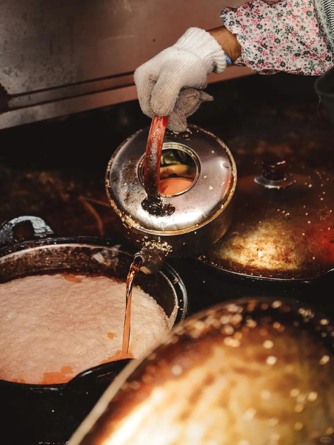 需要先用酒药发酵,等十几个小时之后面团逐渐膨胀上涨,再倒入铁锅内文火慢烧。