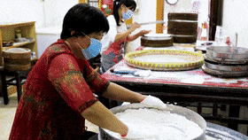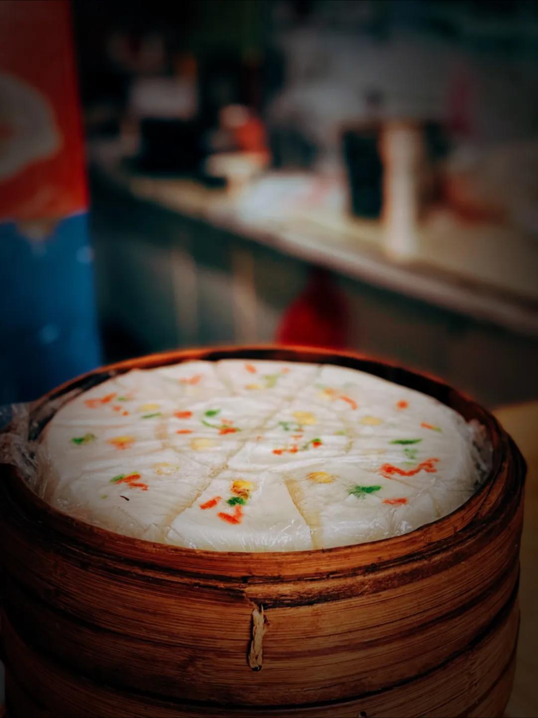 将荷叶放在成型的米粉底部一起蒸,这个时候荷叶、桂花的芬芳和米香共舞,成了有着荷叶桂花香的茵糕。
