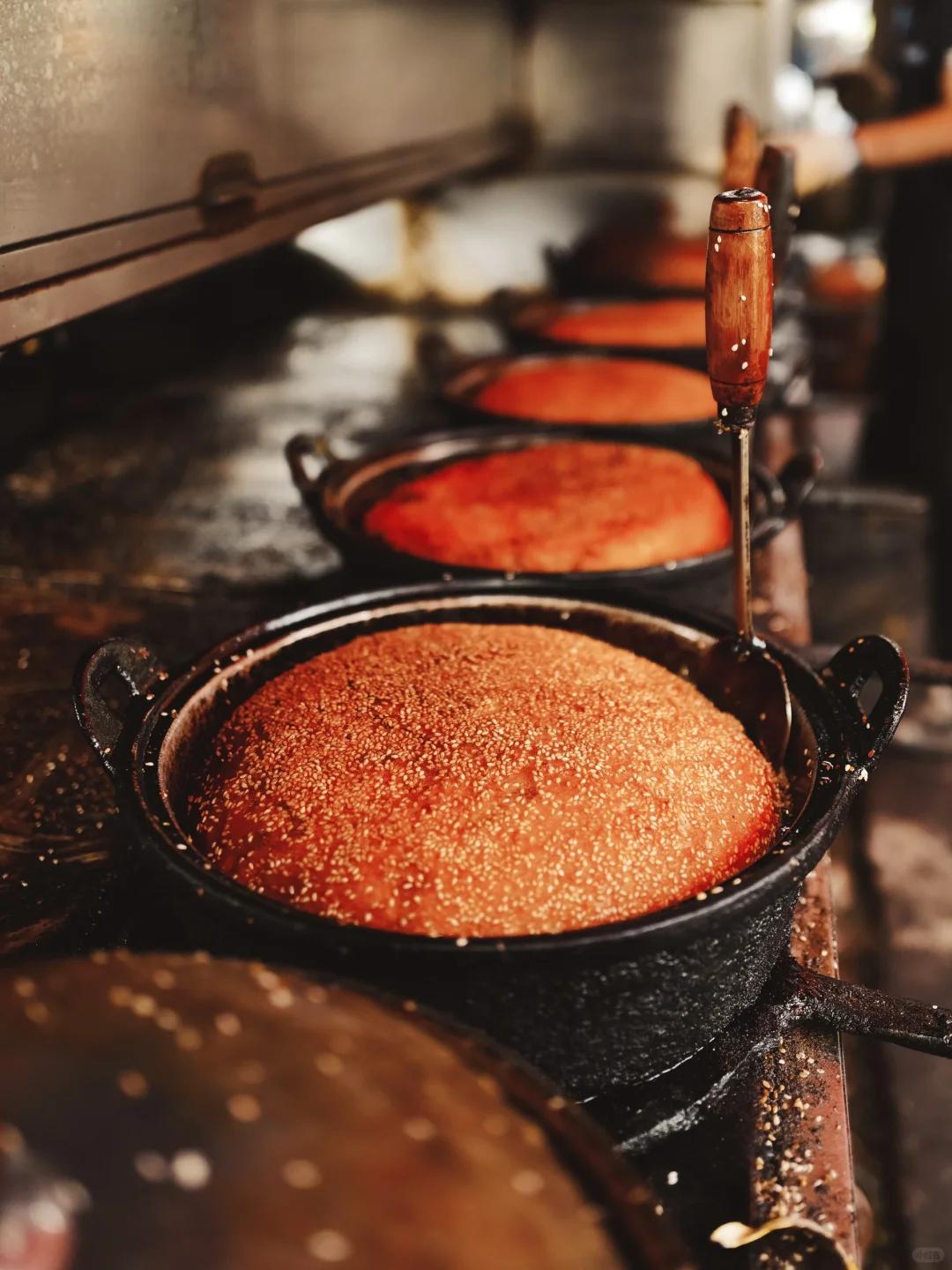 开锅的时候,就沿着锅壁倒入油水。等朝上一面凝固之后,再将烧饼翻身朝下,再次倒入油水,香气扑鼻而来。