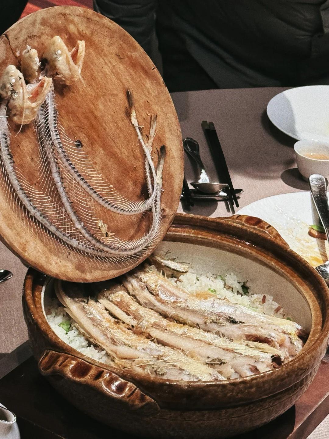 在靖江最常吃的就是刀鱼饭。把刀鱼钉在锅盖上,等到熟了之后,鱼肉会自动的掉入碗里面。
