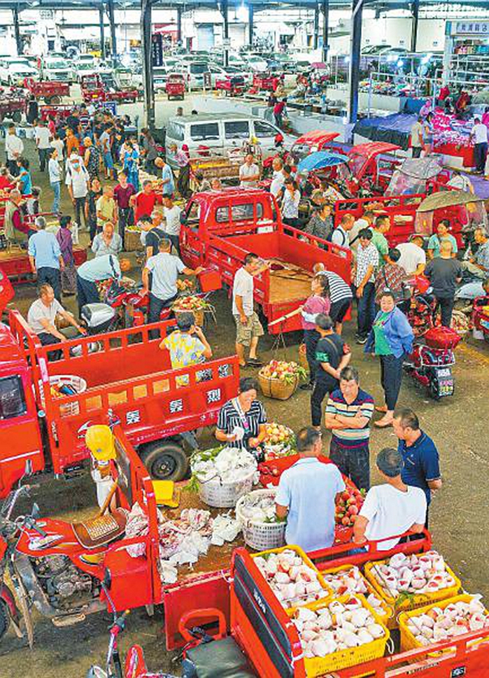 6月18日,红旗村2组村民苏川(左)将250公斤刚采摘的“中山桃”“28号”送到洛带镇综合市场。
