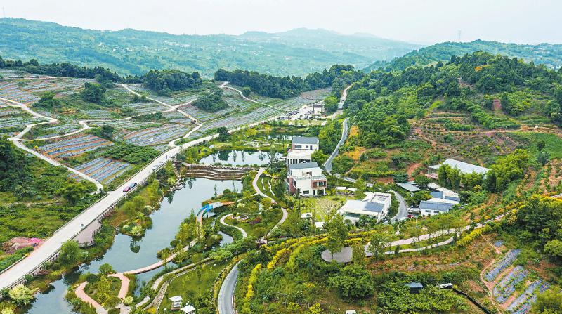 红旗村4组结合山水林盘打造的“新见·书山”、观景廊道、三亩丘田民宿等相继在网上走红。(无人机6月18日拍摄)