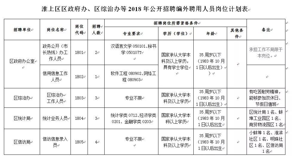 淮上区本次面向社会公开招聘13名编外聘用人员,其中:区政府办3名、区综治办3名、区统计局3名、区信访局4名。