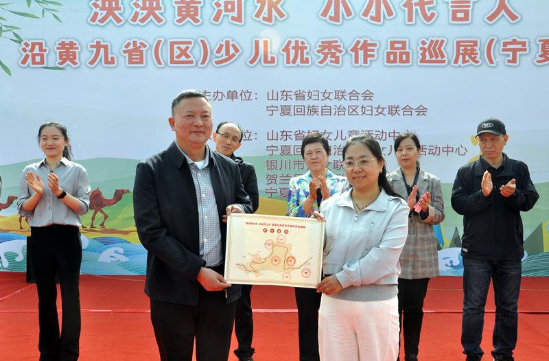 在交接仪式上,宁夏妇女儿童活动中心主任刘维良将巡展证书交予甘肃代表,这场黄河童画之旅5月将抵达兰州。