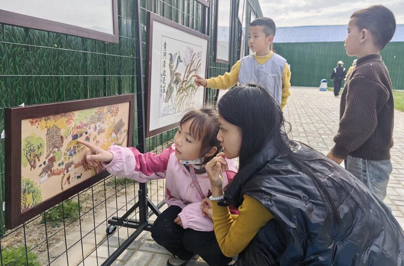 参加活动的家长及孩子们参观沿黄九省区少儿优秀作品