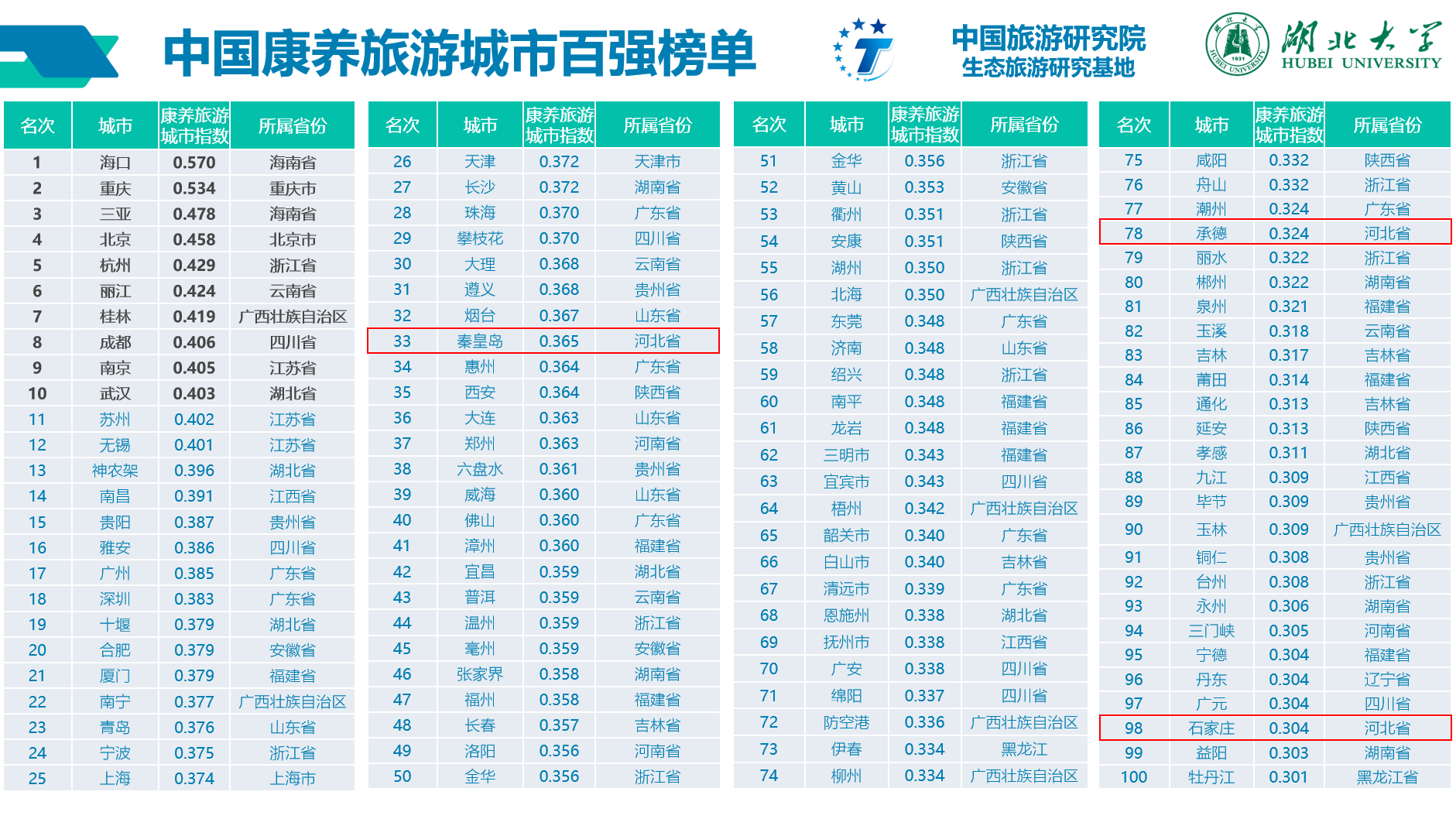 河北新闻网讯(赵少甫)近日,在武汉举办的2021中国文化和旅游高峰论坛主论坛上,《中国康养旅游城市百强榜单》正式出炉。其中,河北省秦皇岛、承德、石家庄三市上榜,分别位列第33位、78位、98位。