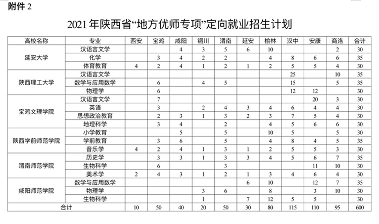 2. 2021年“地方优师专项”招生专业分别为汉语言文学、数学与应用数学、英语、物理学、化学、生物科学、历史学、地理科学、思想政治教育、音乐学、学前教育、美术学、体育教育、小学教育。2021年陕西省“地方优师专项”定向就业招生计划详见附件2。