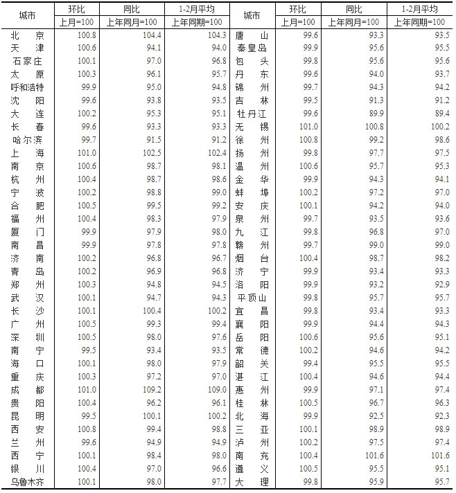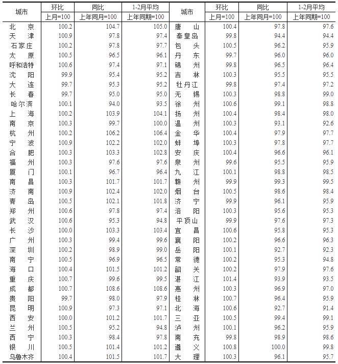 表1:2023年2月70个大中城市新建商品住宅销售价格指数