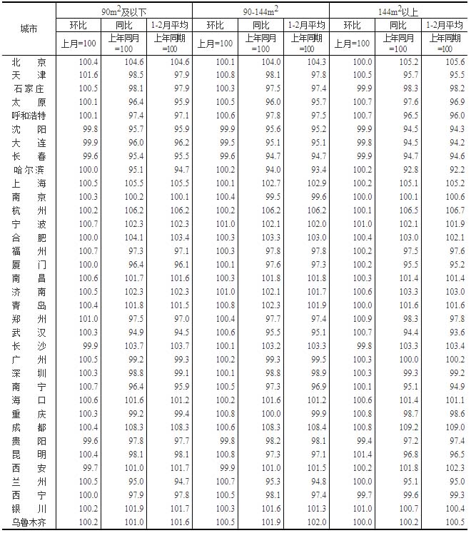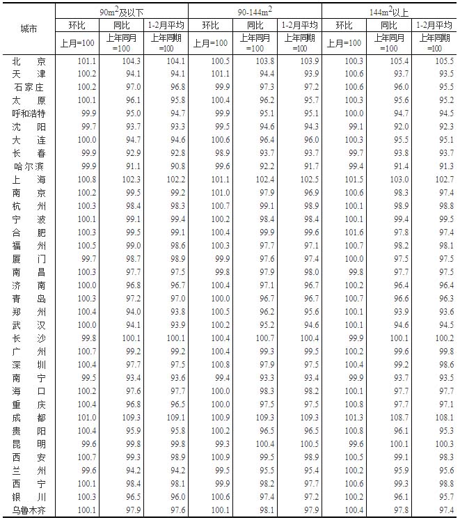 表3:2023年2月70个大中城市新建商品住宅销售价格分类指数(一)