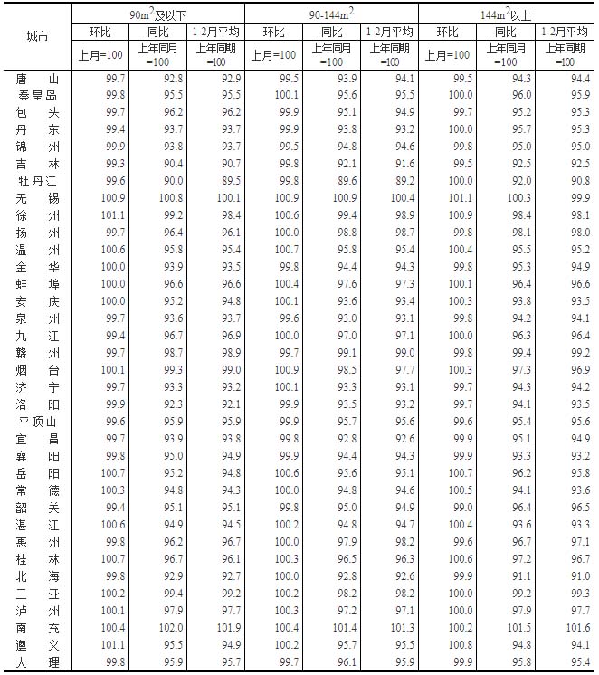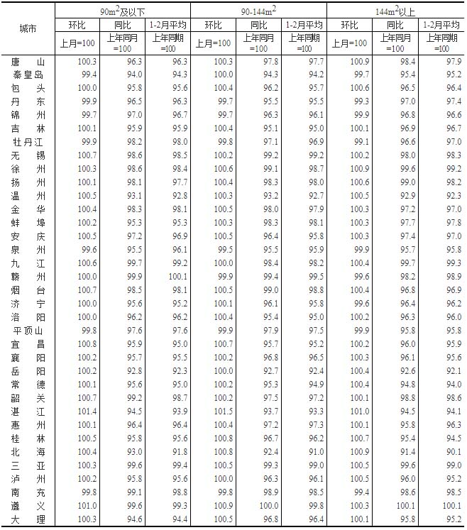 表3:2023年2月70个大中城市新建商品住宅销售价格分类指数(二)