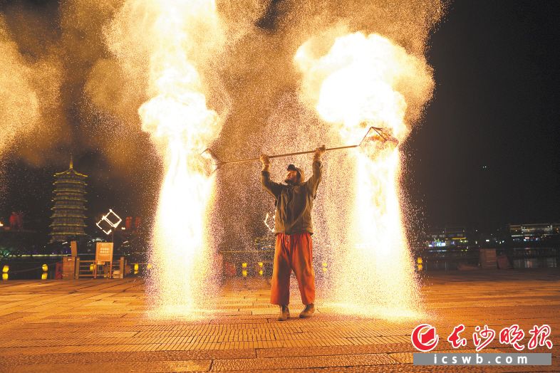 铜官窑国风乐园里“火壶”表演,展示非遗的独特魅力。