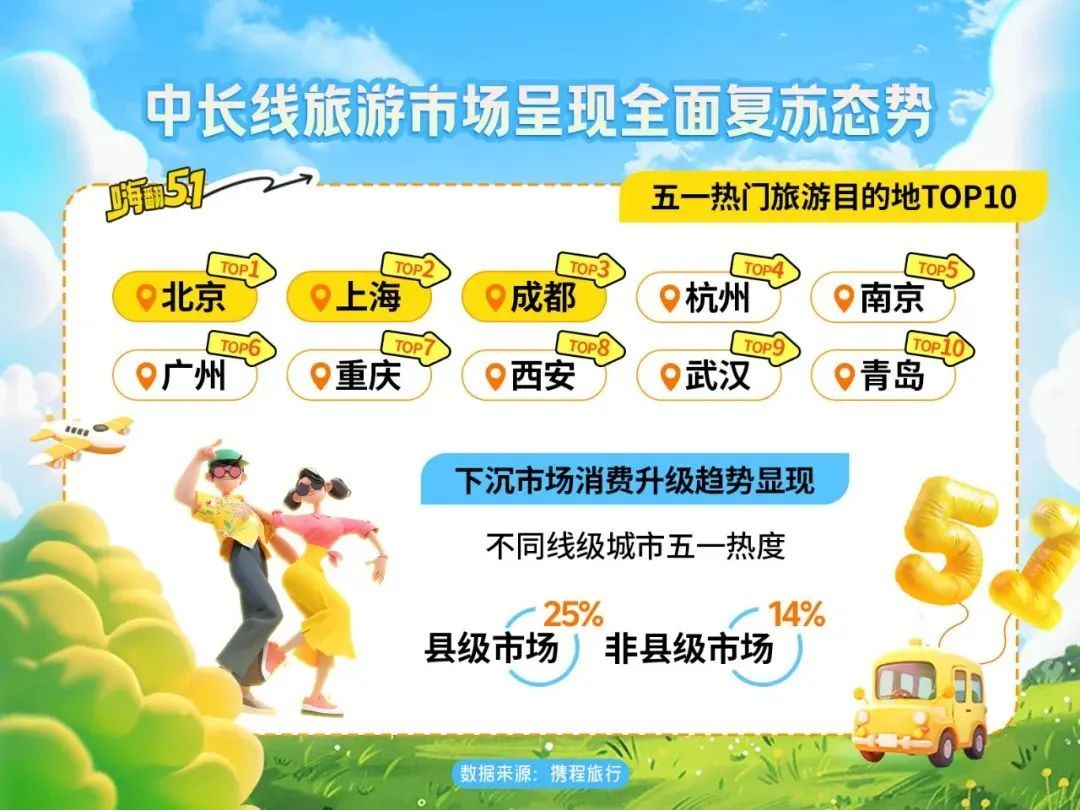据携程发布的《五一旅游出行预测报告》显示,近一周境内酒店搜索热度环比暴涨100%,机票搜索热度飙升80%,入境游订单同比激增173%,全民开启“假日经济新玩法”。
