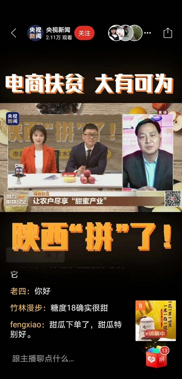 4月23日晚上,“助力脱贫攻坚之陕西湖北专场”公益直播和“电商扶贫之陕西专场”先后在央视新媒体和淘宝、拼多多等平台同步开播,超过千万人涌入直播间。