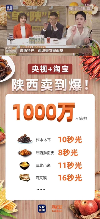 这次直播,除了陕籍的央视主播胡蝶、王筱磊,还有诸多“大咖”助阵。淘宝主播李佳琦,陕西籍明星闫妮、白宇,湖北籍明星袁姗姗依次露面,热情推介家乡美食、特产,使得这次直播更热闹,更有人气。在近两个小时的直播过程中,柞水木耳、甑糕、冰峰汽水、擀面皮、热干面、黄小米、泾渭茯茶等16种陕西和湖北特产、农副产品才是真正的“明星”,柞水木耳、肉夹馍等产品多次补货,却依然是“秒光”。“两万组热干面卖完了!”“柞水木耳补货,也秒光!”“已经没有了!”不断刷新的数字,让人见识了推介人的魅力,更感受到老铁们的热情。
