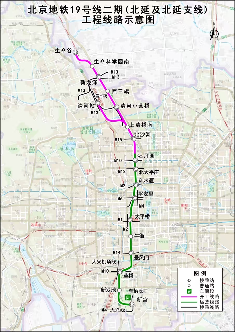 19号线二期(北延及北延支线),全长约24.2公里。其中,北延线路南起19号线一期既有牡丹园站,北至生命谷站,全长约17.1公里,设站7座,分别为北沙滩站、上清桥南站、清河小营桥站、西三旗站、新龙泽站、生命科学园南站、生命谷站,其中换乘站4座;北延支线由上清桥南站出支,北至清河站,全长约7.1公里,设站1座,为清河站,可与京张高铁、昌平线、13号线扩能提升工程换乘。线路建成后,可强化保障首都功能建设,构建城市西北向与中心城区联系的快速廊道,促进中心城区北部和平原新城发展。