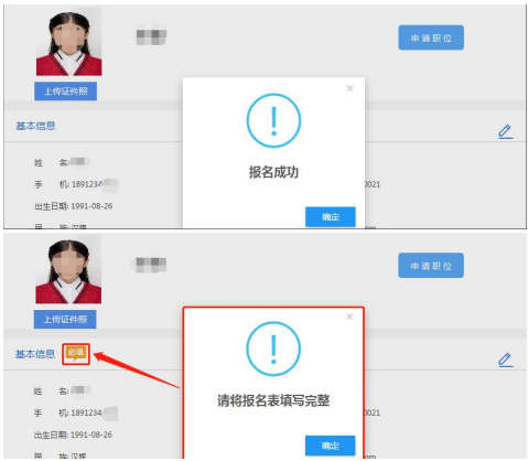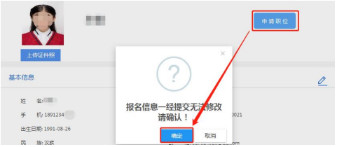 9.申请职位。报名信息、附件填写上传后,点击“申请职位”按钮。系统提示确认后,系统显示报名。若页面提示“请将报名表填写完整”,请考生完成所有必填信息填报后,再点击“申请职位”;