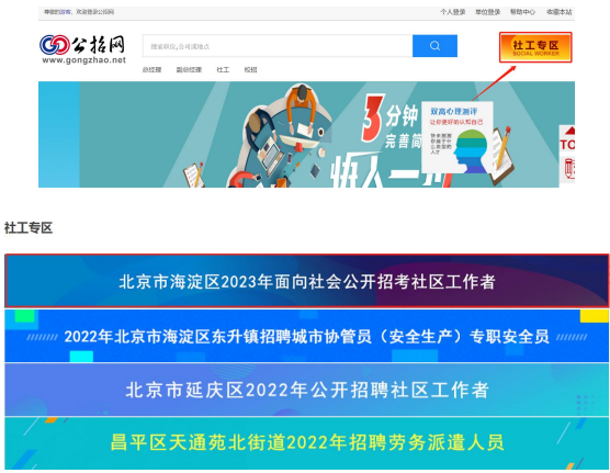1.点击招考公告。在首页 “社工专区”找到“海淀区 2023 年面向社会公开招考社区工作者”,点击进入;