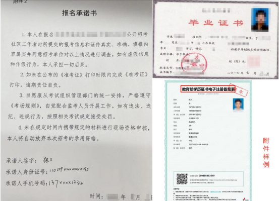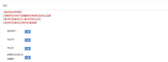 8.上传附件。请在“附件”中依次上传报名承诺书扫描件或照片、毕业证书扫描件或照片、学位证书扫描件或照片、与毕业证书匹配且在有效期内的教育部学历证书电子注册备案表或教育部留学服务中心出具的《国外学历学位认证书》(留学人员提供);党校学历在“教育部学历证书电子注册备案表”项上传党校毕业证即可。