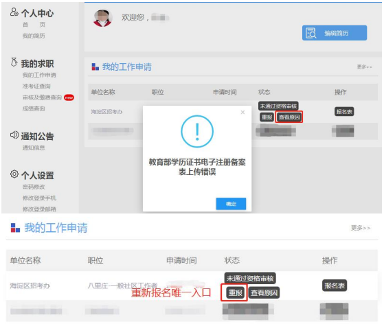 11.重新填报。审核状态显示“未通过资格审核”的考生,点击 “查看原因”按钮,可查看未通过原因。未通过资格审核的考生,若符合招考条件,在报名期间,必须从审核状态处点击“重报”按钮,选择相应职位,修改个人信息后重新申请职位。其他页面均无法进行重报。