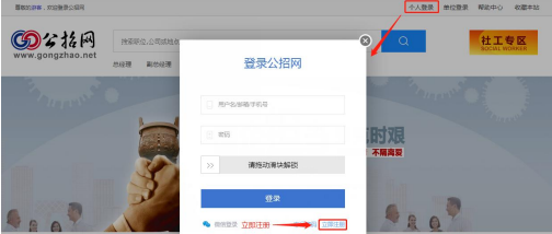 1.个人登录。如考生为登录公招网,请在弹出登录界面先点击“立即注册”,完成账号注册;如考生已注册过公招网账号,请在账号登录后选择相应职位直接报名。