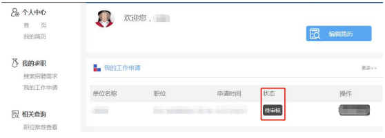 10.查看审核状态。报名后,考生可在个人中心页面,“我的工作申请”中查看申请记录及审核状态。审核状态包括: “待审核”、 “通过资格审核”、“未通过资格审核”。