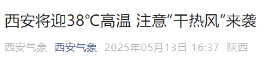 近期西安市以多云天气为主,午后气温较高,16日起最高气温将升至35℃以上,局地最高气温可达38℃,且多吹风天气,阵风可达5-6级,出现“干热风”可能性较大,森林火险气象风险等级持续偏高,需加强防范。