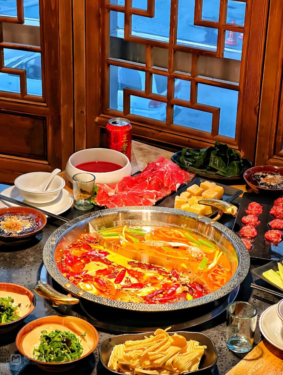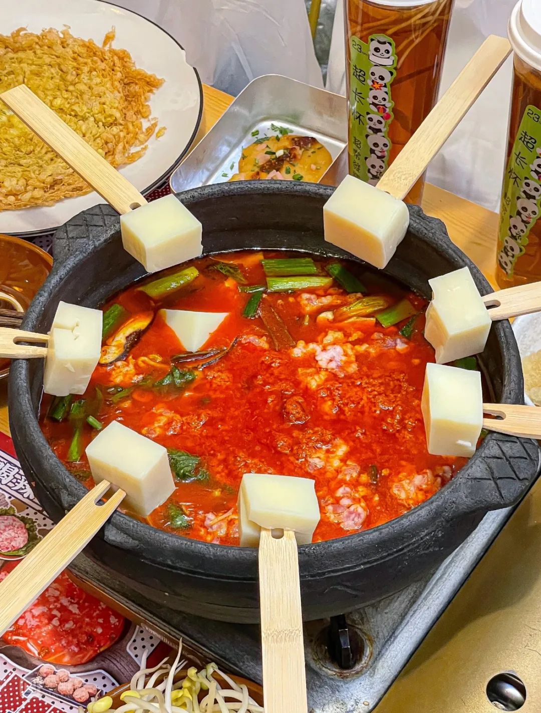 酸汤火锅——锅里放适量猪油,放入葱姜蒜末,加入红酸汤炒香后,倒入高汤或水(觉得太酸,可以加点白糖),等待烧开即可!