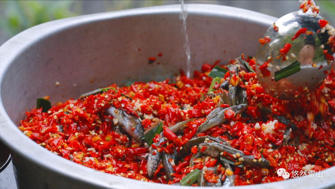 鱼酱酸是黔东南「雷山县」的限定美味。以红辣椒和新鲜小河鱼为主药原料,制作工艺也十分讲究。辣椒加上生姜和木姜子,打碎后和小河鱼混合,一起放入坛中。鱼酱慢慢发酵,沉淀出不可复制的美味。