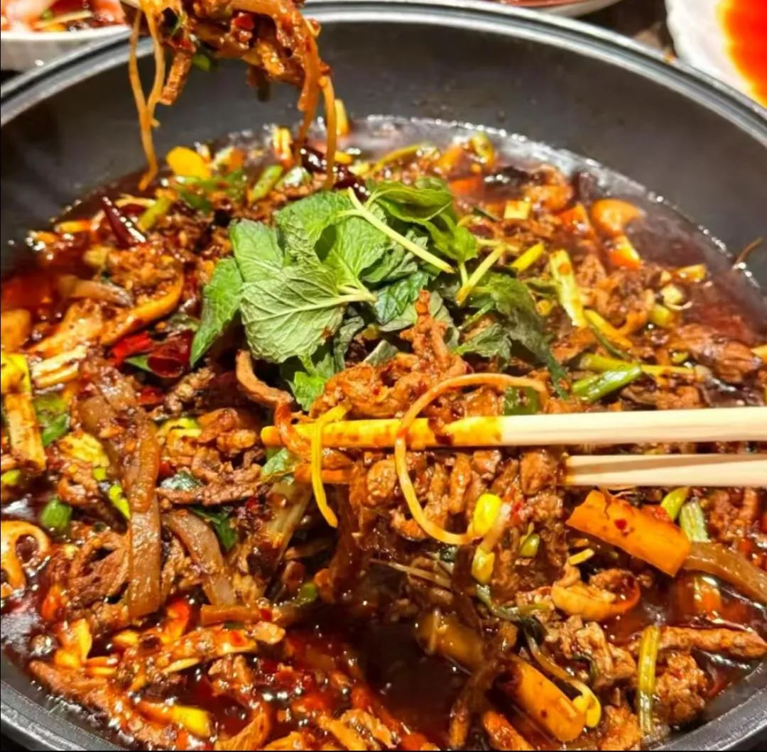 虾酸干锅牛肉——嫩滑的牛肉,加入虾酸翻炒,吸满酸辣的汤汁,一口就上头。