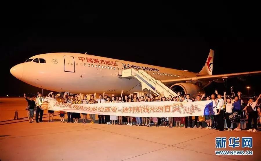 ▲8月28日晚,从西安飞往阿联酋迪拜的东方航空MU705次航班机组人员和乘客在登机前合影留念。(图片来源:新华社)