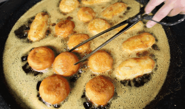 在金泽古镇,你可以品尝到自制肉馅的烧麦,据说配方都是独有的。还能吃到两种口味的油墩子,咸味的是肉馅,甜味的是豆沙馅。每天一早,店门前的油锅里就开始滋啦滋啦地炸着油墩子,一个个胖胖的个头很大。