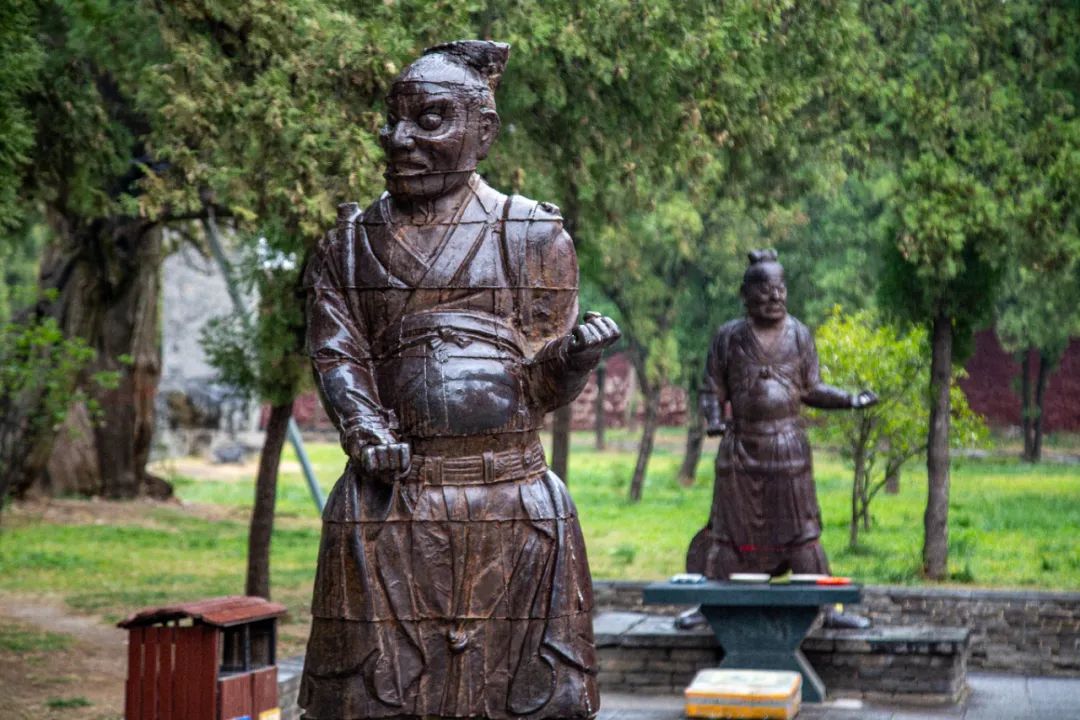 从太室阙出来,沿着有两千年历史的神道前往规模庞大的中岳庙。中岳庙是河南省现存规模最大的古建筑群,也是五岳中规模最大的祭祀山神的庙宇。现存建筑多为清代重修,但庙内保存了不少数千年的古柏和历代名碑,四尊宋代铁人千年不锈,仍然保卫着昔日的神库。
