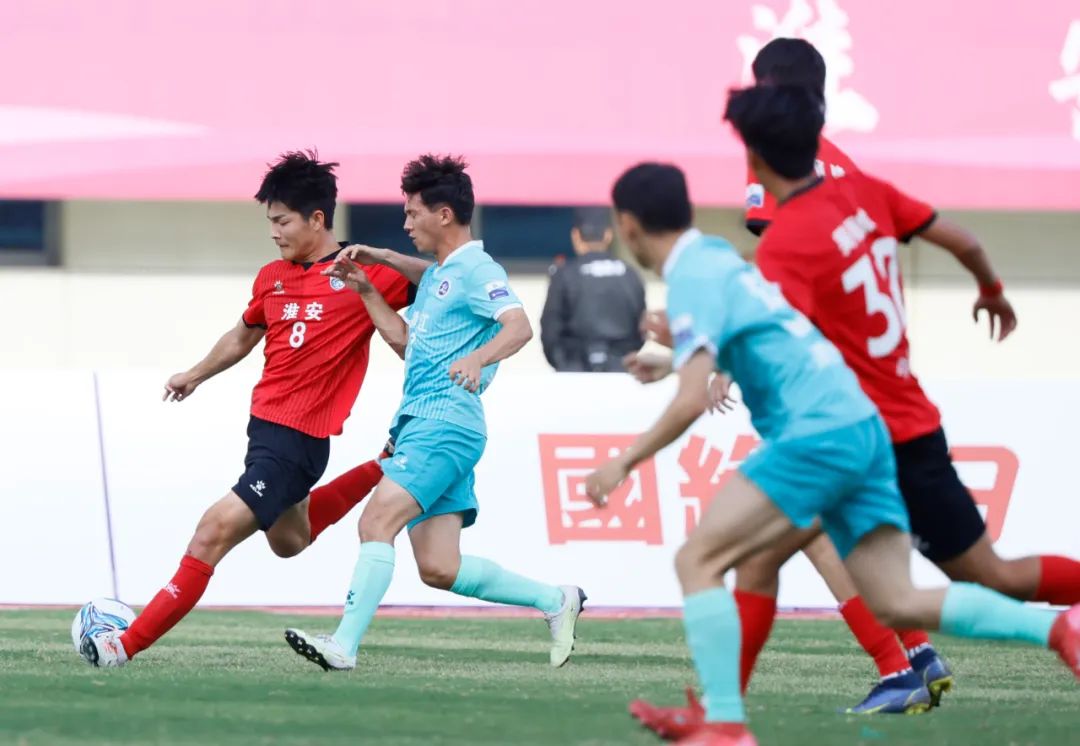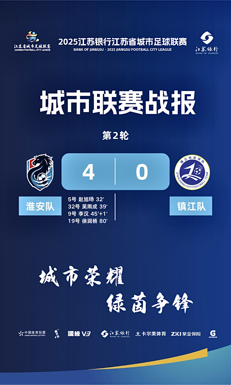 当天15:00,随着主裁判的一声哨响,比赛正式开始,双方球员传球、控球,闪转腾挪、脚下生风,场上局面瞬息万变,比赛第32分钟,淮安队5号球员赵旭旸接中场长传,在球门前小角度头球攻门,帮助球队首开纪录。随着比赛深入,在你追我赶、攻防转换的精彩表现中,淮安队以4:0战胜镇江队,主场告捷。