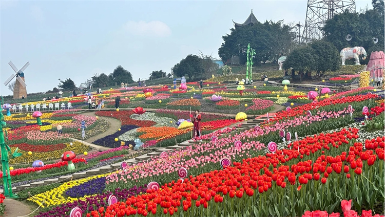 彩山景区拥有近80万株各色花卉,构成一幅绚丽多彩的大地调色板景观,为市民提供一个集观赏、休憩、游玩于一体的花卉景观花园,尽显人与自然的和谐之美。