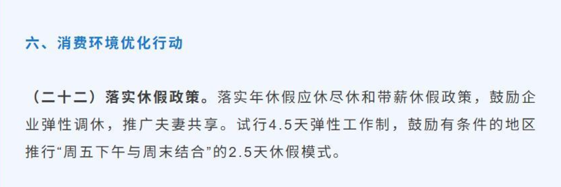 相关报道称,近日,四川绵阳市商务局印发《绵阳市提振消费专项行动2025年工作清单》(下称《工作清单》),旨在全面提升居民消费能力和市场活力,其中消费环境优化行动中的落实休假政策提到,试行4.5天弹性工作制,鼓励有条件的地区推行“周五下午与周末结合”的2.5天休假模式。