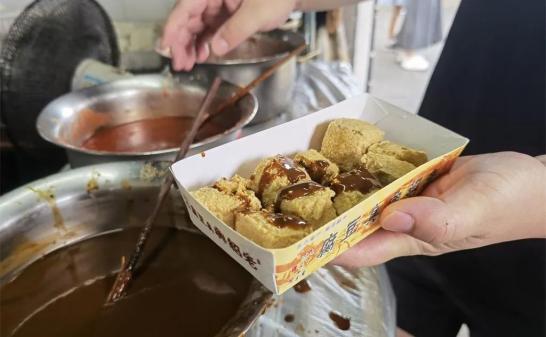 绍兴臭豆腐作为民间休闲小吃,街头巷尾随处可见。绍兴臭豆腐经过选料、配卤、浸泡、发酵、晾干、油炸等精细制作,将豆腐切成块状,用卤水煮熟后浸泡在臭水中,然后晾干后油炸。