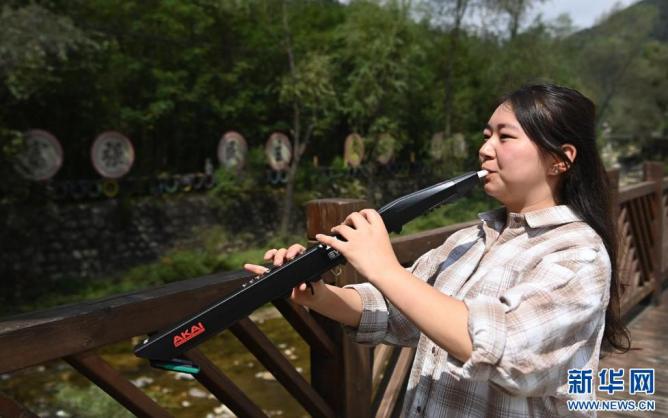 凤凰镇音乐爱好者“柞水小阿飛”在演奏电吹管(9月14日摄)。她是当地一名自媒体创业者,酷爱音乐,擅长葫芦丝、吉他、电吹管等各种乐器,把对音乐的热爱融入生活的点点滴滴!在网络媒体的推动下,如今凤凰古镇也融入了许多现代城市的元素。