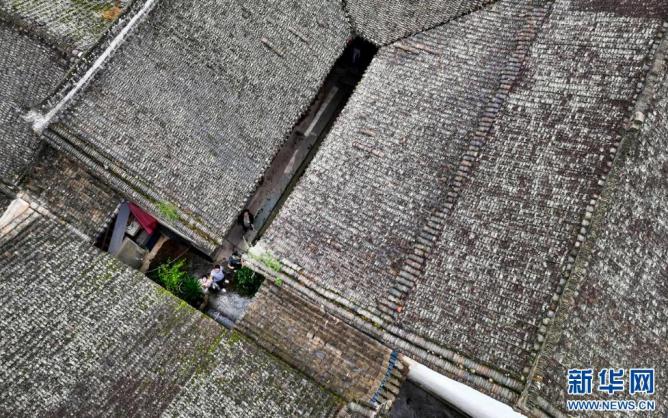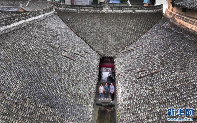 游人在凤凰镇参观古钱庄四合院(9月11日摄)。四合院屋顶呈人字形,屋檐前采用滴水瓦,防止雨水散布。房屋山墙由下而上,筑有与屋脊齐平的防火墙,以防邻屋失火蔓延。