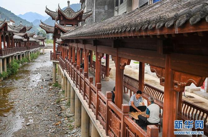 居民在凤凰镇古建筑长廊下棋休闲娱乐(9月11日摄)。