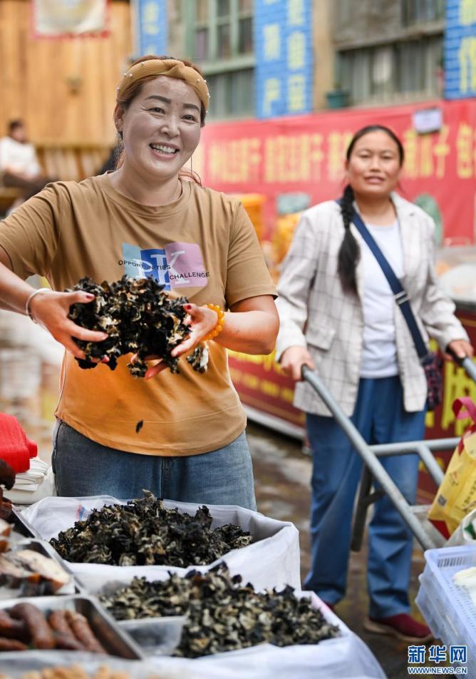凤凰镇土特产店主人宁远琴(左)在向游人推销木耳(9月11日摄)。古老的街市上,来自秦岭山区的土特产异常丰富,香菇、木耳、腊肉等,最有影响力的是柞水木耳,它是国家地理标志产品,人工种植的木耳产业规模颇大。
