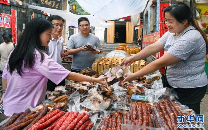 游人在凤凰镇老街购买当地土特产(9月11日摄)。