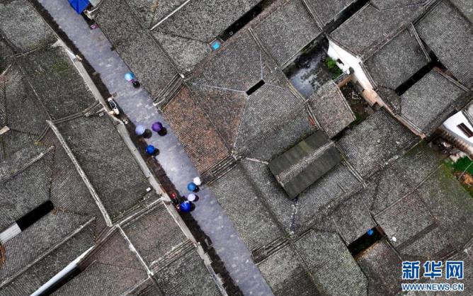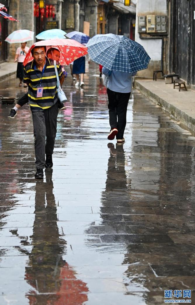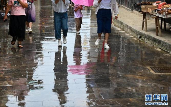 匆匆的游人在绵绵细雨中,感觉凤凰镇江南的韵味(9月11日摄)。