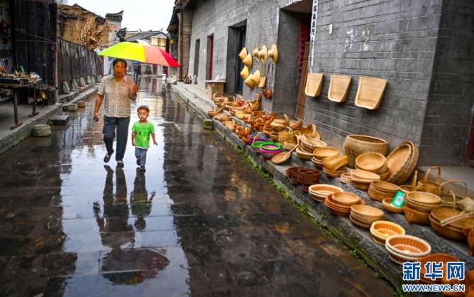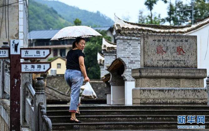 购买物品的居民走在凤凰镇老街街头,与熟人回眸(9月11日摄)。