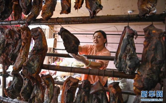 凤凰镇老街上的特产店徐丽在整理来自秦岭山区土猪肉制作的腊肉(9月11日摄)。这是凤凰古镇街头一道美丽的风景,用这些腊肉烹制的菜肴十分鲜美。