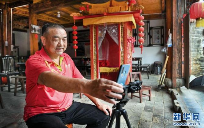 凤凰镇老屋主人郭伦鹏一边守着商铺,一边进行视频直播,向外推介凤凰古镇的风情(9月11日摄)。